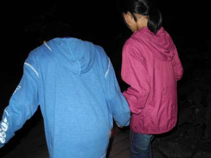 宿から少し歩いたところに、憾満ケ淵(かんまんがふち)というところがあり、化け地蔵がならんでいます。田中先生のこわ〜い話を聞いてから、くじで決まったペアで、きもだめしのはじまりです。真っ暗な中を、懐中電灯一つで、お互いの手を離さずに進んでいきます。男子はしっかり女子を守っていました。