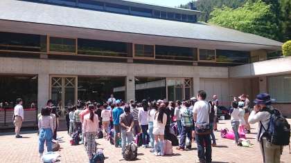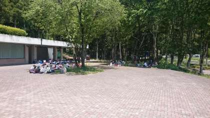 無事にふじやまビレジに着きました。開室式のあと、昼食です。暖かく、爽やかな風がふいています。