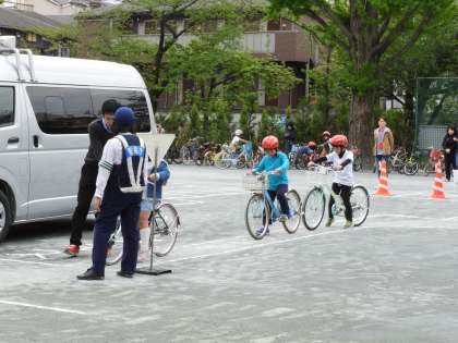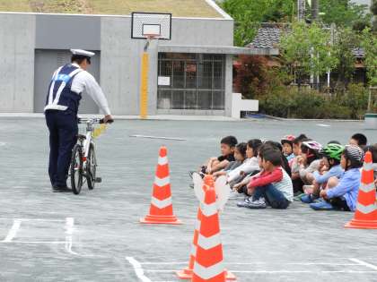 本日、1年生(1校時)と3年生(2校時)の児童対象に交通安全教室を実施しました。警察の方から歩行指導(1年生)、自転車の乗り方指導(3年生)を受けました。今日の指導で学んだことを活かして交通安全に心がけてほしいです。