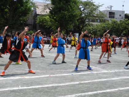 「3・4年生 肝高の阿麻和利」表現運動では沖縄の民族舞踊に挑戦して、しっかりまとめました。「1年生チェッコリ玉入れ」他学年の児童や教員も可愛らしく一緒に踊り、和やかな競技となりました。