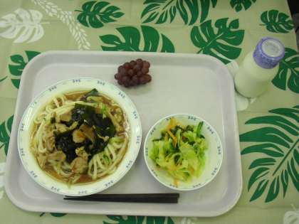 今日の給食「五目冷やしうどん・ゆで野菜カレードレッシング・牛乳・デラウェア」