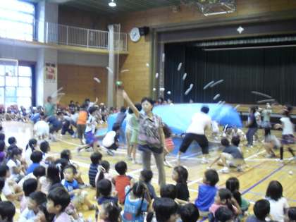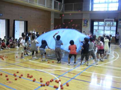体育集会で玉入れをやりました。シートの中に多く玉が入った方が勝ちです。運動会の赤白に分かれ、学年対抗で競技しました。シートを上下に動かして邪魔をするのは運動委員会の児童です。熱戦の結果、赤組の僅差の勝利でした。(9月9日)