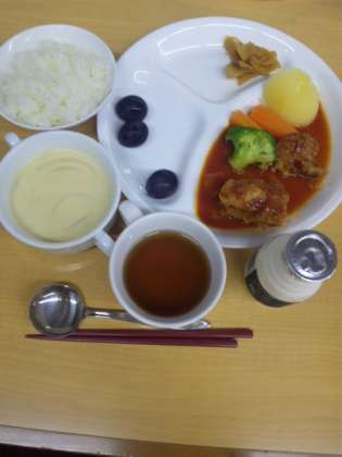 川場の夕食メニューは[鶏肉のトマトソース煮・コーンポタージュ・ご飯・のむヨーグルト・巨峰]です。みんな美味しく食べました〓