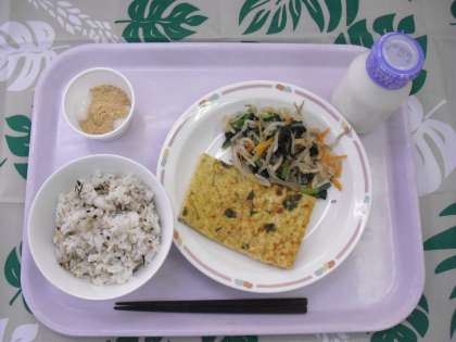 今日の給食『炊き込みひじきごはん・千草焼き・おひたし(油揚げ)・月見だんご』