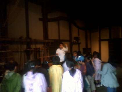 江戸時代に作られた農家の土間で、昔の生活の様子を教えていただいています。