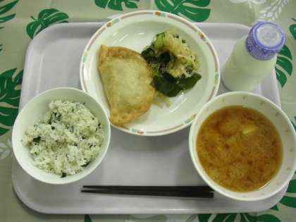 今日の給食『わかめごはん・ジャンボぎょうざ・じゃこサラダ・味噌汁・牛乳』