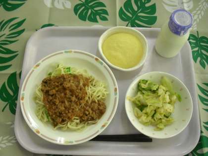 今日の給食『ジャージャー麺・中華サラダ・マーラカオ・牛乳』
