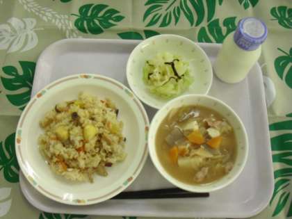 今日の給食『秋の香りごはん・豚汁・キャベツの塩昆布かけ・牛乳』