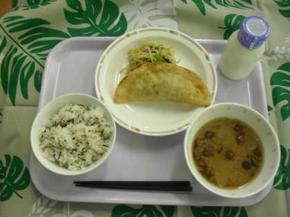 本日のメニューは炊き込みひじきご飯、牛乳、ジャンボ餃子、おひたし、なめこ汁。