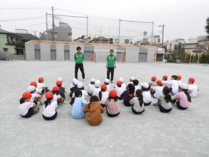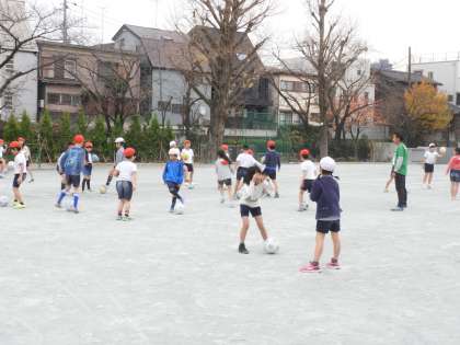 12月8日(金)3年生対象に、東京ヴェルディのコーチを招いてサッカー教室を実施しました。3校時・1組、4校時・2組、児童たちはボールに親しみながら、楽しんでサッカーの基本を学びました。さすがプロのコーチ、児童の心をつかんで、寒空の下でしたが、子供たちは大喜びで、走り回りました。