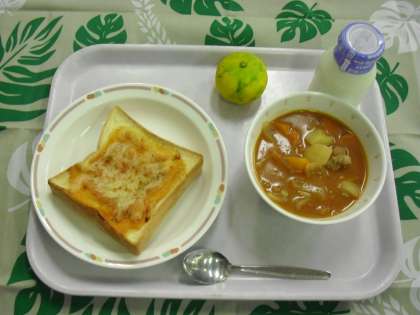 本日のメニュー[チーズトースト・トマトシチュー・牛乳・みかん]