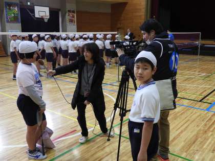 2月21日、オリンピック・パラリンピック教育推進の取組として5年生対象にバドミントン実技講習会を行いました。バルセロナ五輪・アトランタ五輪に日本代表として出場した町田文彦選手を講師としてお招きしました。児童は町田選手のラリーを実際に見て、打ち合うシャトルの速さに換声を上げていました。バドミントンの基本を分かりやすく教えていただき、楽しく有意義な体験授業となりました。ケーブルテレビの取材もあり、15分の番組に編集されたものが3月に放映予定です。