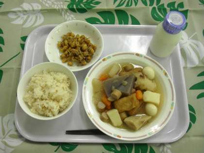 本日のメニュー『茶めし・洋風おでん・大豆とじゃこのあまから揚げ・牛乳』
