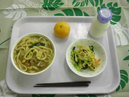 本日のメニュー『カレーうどん・和風サラダ(大根)・みかん・牛乳』