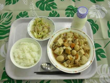 豆腐料理は、口あたりがよいので人気のメニューです。豆腐は奈良時代に遣唐使によって伝わったとされています。中国・韓国・台湾・ベトナム・タイ・ミャンマー・カンボジア・インドネシアと日常的に食べられている国は多いです。豆腐は[健康食品]と言うこともあり、今や世界中の食卓にのぼっています。(11月4日 保健美化給食委員会 昼の放送発表より)