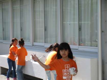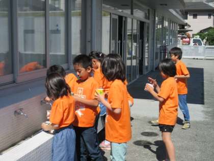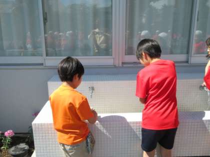 校庭で赤Tが練習しているその横では、オレンジTが理科の学習をしています。