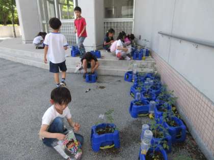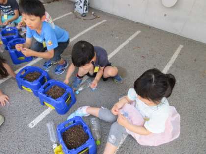 植木鉢に、土を入れて、ペタペタたたいて、ならします。