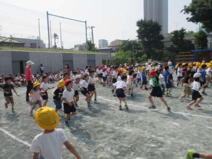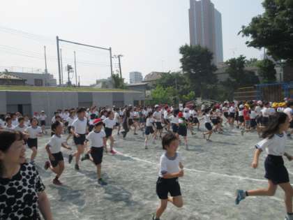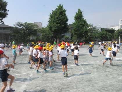校庭の東側から西側(体育館側)まで、オニにつかまらずに渡り切るゲームです。