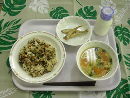 本日のメニュー『ひじきごはん・吉野汁・わかさぎの天ぷら・牛乳』