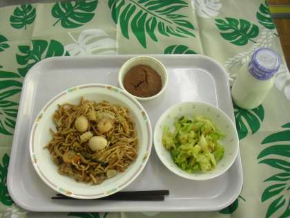 焼きそばは家庭では麺は炒めますが、世田谷区の給食では、まず麺を油で揚げてから具とまぜ、時間を少し開けて蒸らし、その後もう一度混ぜ合わせます。そうすることにより、麺をのびない様にしています。(殺菌の意味もあります。)特別な食感があるので、児童・職員にも人気があります。給食の焼きそばは、ほとんど油で揚げますが、あぶらっこく仕上げないよう、麺を高温できちんと揚げるのがコツになっています。