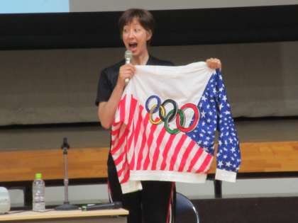 今日は、アクティブライフ研究実践校としての活動の一つとして、元バレーボール・アメリカ代表のヨーコ・ゼッターランドさんの講演会と、5年生への実技指導がありました。