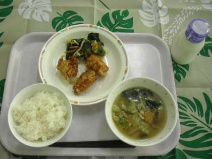 本日のメニュー『ごはん・鶏肉のレモンソースかけ・和風サラダ・野菜スープ』