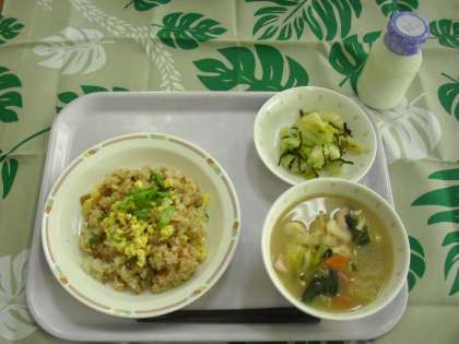 本日のメニューは、そぼろごはん、牛乳、すいとん、白菜の塩こんぶがけです。
