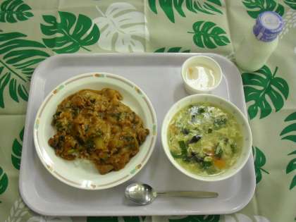 本日のメニュー『キムチ丼・にら玉スープ・杏仁豆腐・牛乳』