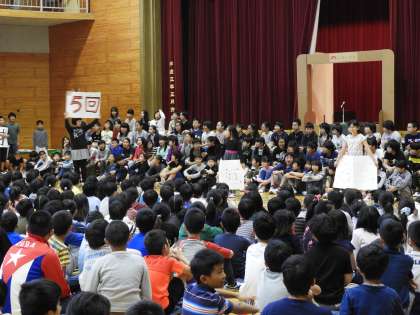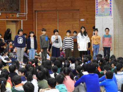 11月2日(金)代表委員、集会委員、音楽委員の児童が企画・運営して創立90周年ロング集会を行いました。(1)はじめのことば、(2)歌「ぼくとわたしの太子堂」、(3)太子堂クイズ、(4)5・6年生の発表《よびかけ・太子堂CM・歌「ゆうき」「太子堂の未来へ」》、(5)校歌、(6)校長先生の話、(7)おわりのことば という盛りだくさんの内容。太子堂小学校90周年を祝うために委員会の児童が工夫を凝らした演出が見事、体育館を笑いと感動の渦に巻き込みました。児童・教職員ともに温かい気持ちを共有できた時間でした。