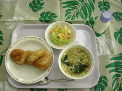 本日のメニュー『あげぱん・卵雑煮・キャベツサラダ・牛乳』
