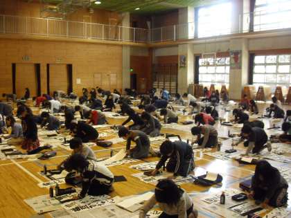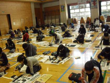 高学年の校内書き初め大会を体育館で1・2校時に行いました。「字の大きさやバランスに注意して書くことができたよ」と、静かに集中して書くことができました。