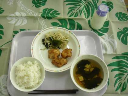 本日のメニュー『ごはん・鶏肉のレモンソースかけ・和風サラダ(もやし)・すまし汁・牛乳』