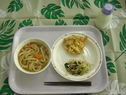 本日のメニュー『煮込みうどん・かき揚げ(ほたて)・おひたし(青菜)・牛乳』