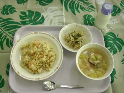 本日のえびチャーハンにバナメイエビが使われています。エビは、日本産の物がなかなか手に入らないので、残念なことにインドネシア産のものです。給食の食材は努力して日本の物を使用することを心がけていますが最近では、国産の魚類は高価で給食では手に入れるのは難しいです。