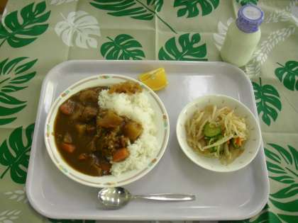 本日のメニュー『カレーライス・福神漬け・こんにゃくサラダ・スウィートスプリング・牛乳』