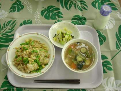 本日のメニュー『そぼろごはん・すいとん・白菜の塩昆布かけ・牛乳』