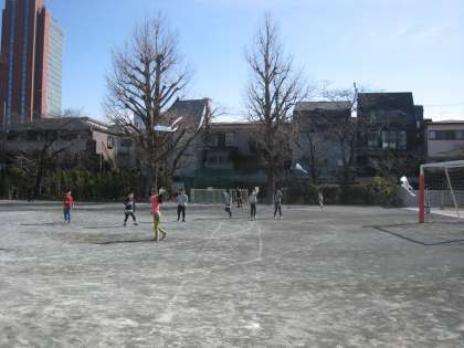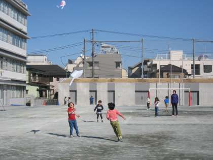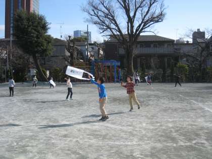 2月21日、生活科の授業「昔遊び」で1年3組の児童は歓声をあげながら笑顔で凧を揚げていました。風が程よく吹く午後の陽差しの中、のどかな光景です。