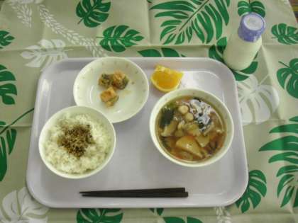 2月15日のメニュー『ごはん・ゆかりふりかけ・ますの天ぷら・あんかけ汁・牛乳』