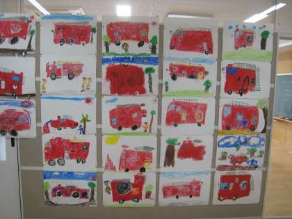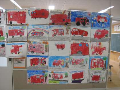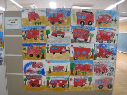 先日、消防写生会で1年生が描いた絵を各学級の廊下壁面に展示しています。児童が頑張って描いた力作揃いなので、来校される際には是非見てください。