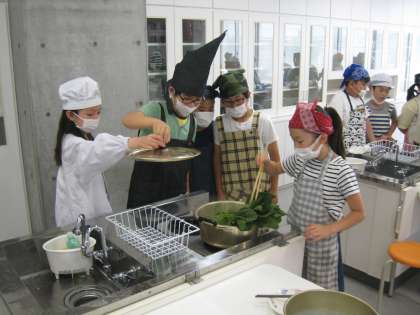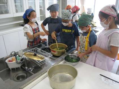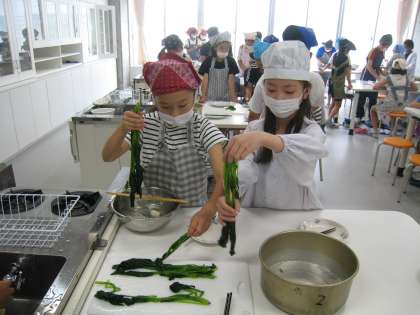 6月5日、家庭科の時間に「はじめてみようクッキング」という課題に取り組みました。班ごとにホウレンソウを茹で、しぼり、一口サイズに切りました。全員が用意できた班から試食しました。楽しみながらも調理器具を真剣に使って実習に励んでいました。