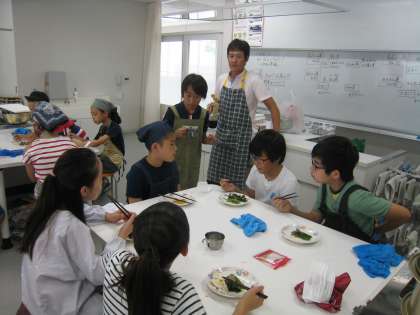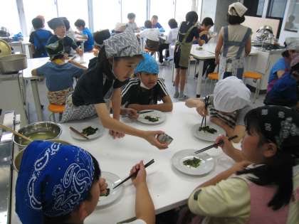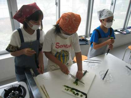 6月5日、家庭科の時間に「はじめてみようクッキング」という課題に取り組みました。班ごとにホウレンソウを茹で、しぼり、一口サイズに切りました。全員が用意できた班から試食しました。楽しみながらも調理器具を真剣に使って実習に励んでいました。
