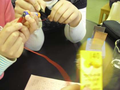 子どもたちの考えは……。実験してみると「牛乳の中に入れても電流は流れないよ」という意見もありましたが……。どれも微弱な電流が流れ、電子メロディから、かすかな音が聞こえてきました。
