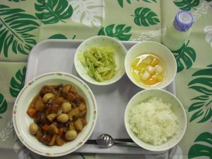 本日のメニュー『ごはん・酢豚・中華サラダ・フルーツ白玉・牛乳』