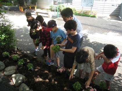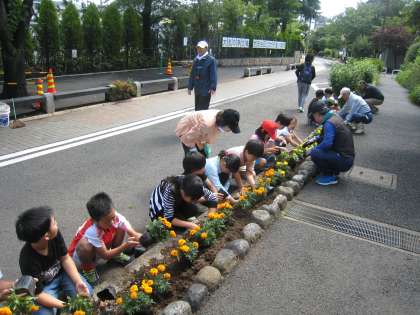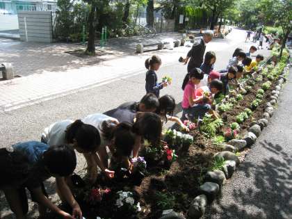 6月11日、3年生は、地域の方やまちづくりセンター職員の方に指導されて正門前の緑道に花を植えました。久しぶりに青空が見られたこともあり、児童は笑顔で花植えを行っていました。緑道を通る際にご覧になってください。