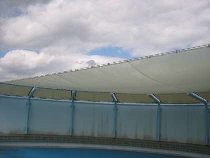 熱中症対策としてプール東側の見学者スペースに日除けを設置していただきました。遮光性があり雨は浸透する化学繊維です。