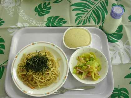 本日のメニュー『和風スパゲッテイ・イタリアンサラダ・いちご蒸しパン・牛乳』