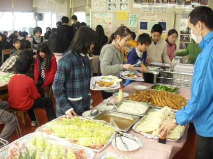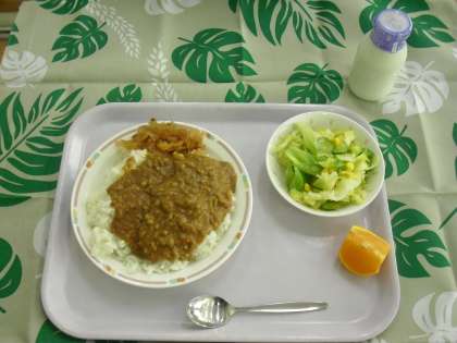 日本で初めてキーマカレーを出したのは九段下のお店ですが、キーマカレーはインドがやはり本場です。玉葱、人参など野菜をみじん切りまたは、あられ切りにしたものとひき肉を炒め、香辛料と調味料を加えて少量の水で煮込みます。インドでは山羊肉を使ったキーマカレーが主流です。ヒンドゥー教、イスラム教の食のタブーから豚や牛肉のキーマカレーは、ほぼ皆無です。インドでは、キーマカレーはチャパティやナシ、ごはんで食べられます。また、ナス、ジャガイモ、グリーンピースを炒めたものが入っている場合、キーマ・マタルとヒンドゥー語で言われています。<保健美化給食委員会 昼の放送発表より>   写真右 6年生のバイキング給食の様子