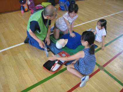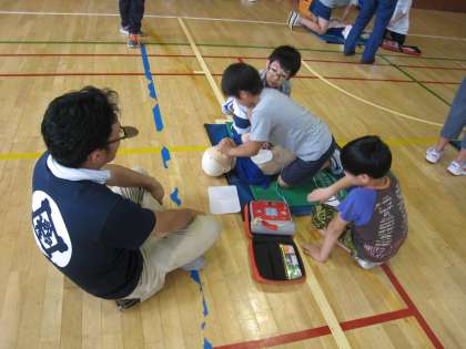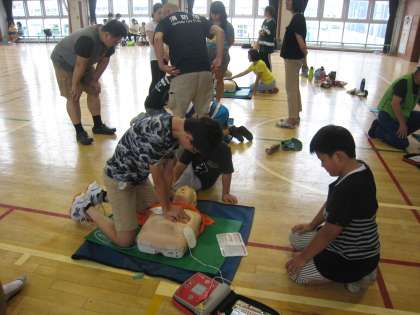 7月20日〜21日、第22回サバイバルキャンプを実施しています。災害時に正しい行動をとり、自分たちの町を大切することを目的としています。たくさんの地域・PTAの方に協力していただき、児童・生徒が充実した体験をできることに感謝しています。内容は、車椅子・白杖を用いた要救護者訓練、ろうそく作り、AEDを使用した応急救護訓練、三角巾を使用した応急手当訓練、搬送訓練などを行いました。夕方、炊き出し訓練で、班ごとに取り組んだカレーライス作りでは、どの班も満足な出来栄えでした。希望者によるドラム缶風呂体験は、児童の賑やかな声が校庭に響き渡りました。夜は、防災VTRの視聴、グループ討議では、班ごとに危険な場所・避難所でできるお手伝いを話し合い、発表しました。最後は、各々が作ったろうそくを点灯して、光の道を作り1日目の終了です。