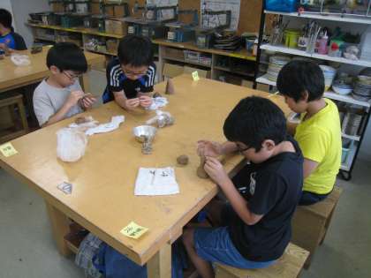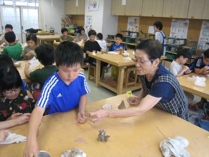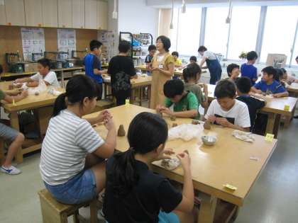 7月22日〜8月2日まで、ワークショップ事務局主催の「太子堂ワークショップ」を開催しています。職業が多岐に渡る講師陣が沢山の講座を開設し、児童が興味・関心のある講座を選んでいます。高学年によるシーサー作りの様子です。皆、粘土の感触を楽しみながら作っています。