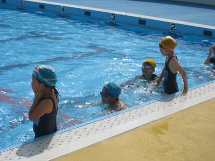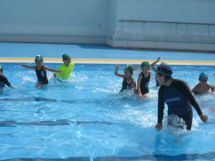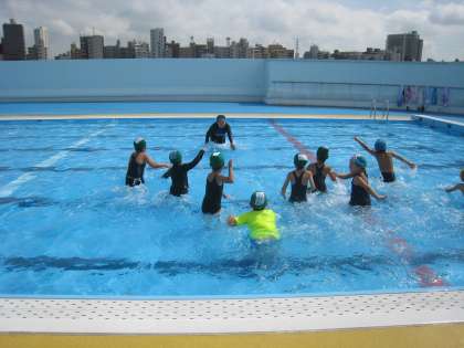 7月23日、ワークショップ事務局主催の太子堂ワークショップの様子です。「水泳・低学年」講座では、水に慣れて、泳ぐことが好きになるように指導をしていました。児童は歓声をあげ、水しぶきを楽しみました。